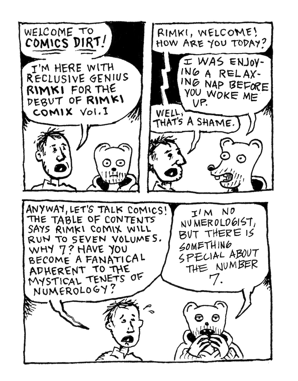 The letters column includes a few pages from a comics interview zine I sent to Rimki in response to Rimki Comix v.1: Land of the Dead, in which I left his speech balloons blank for him to fill in his replies. Here are the first and last pages of the interview, which don't appear in The Garden Cat: